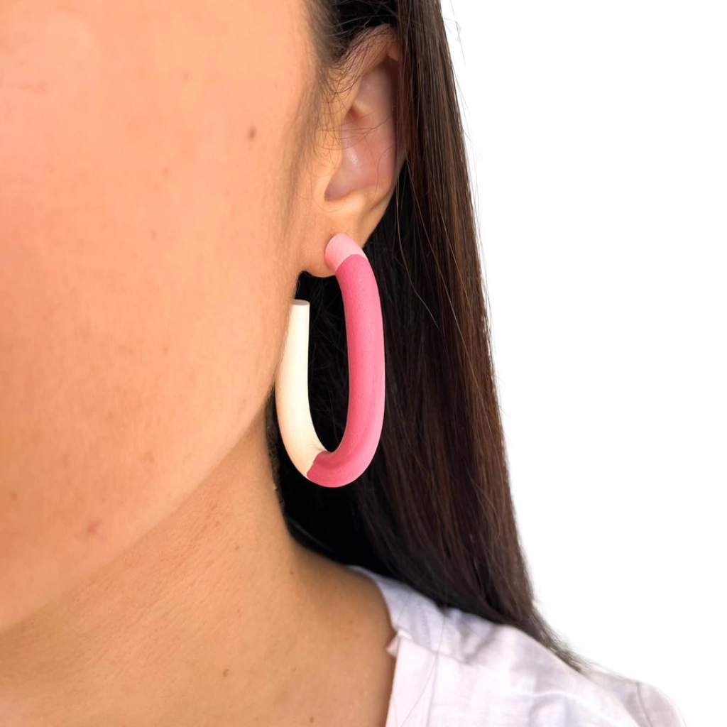 Brinco Anna Rosa, uma peça feita e moldada à mão em cerâmica plástica. Cada brinco é único, garantindo que você tenha um acessório exclusivo que complementa sua personalidade.