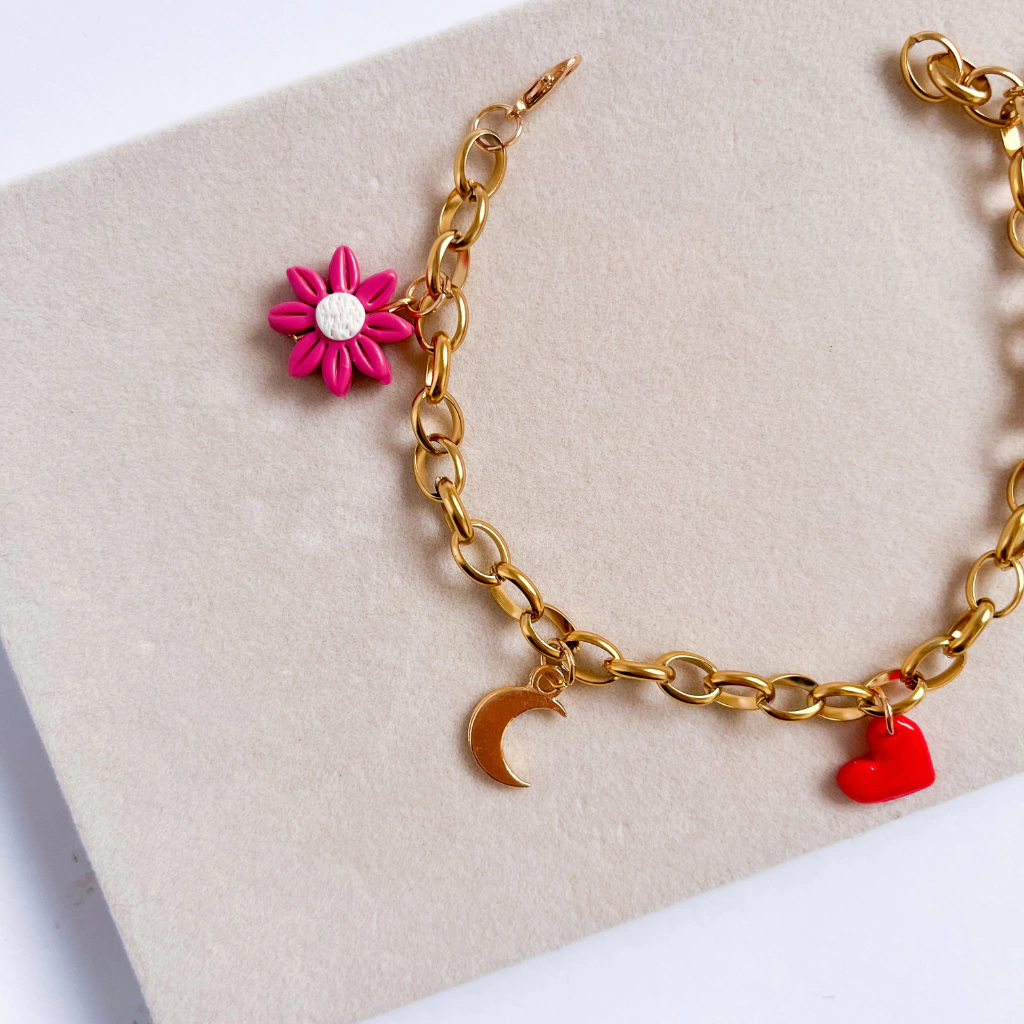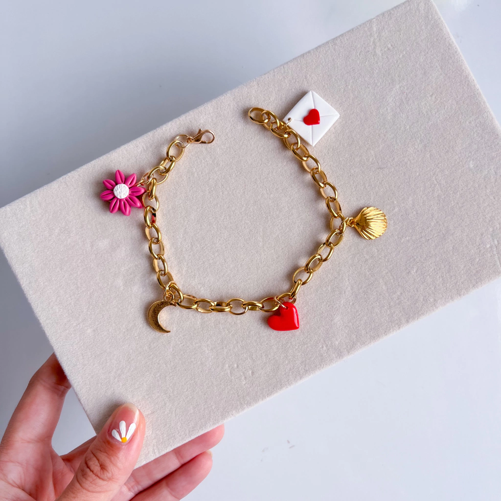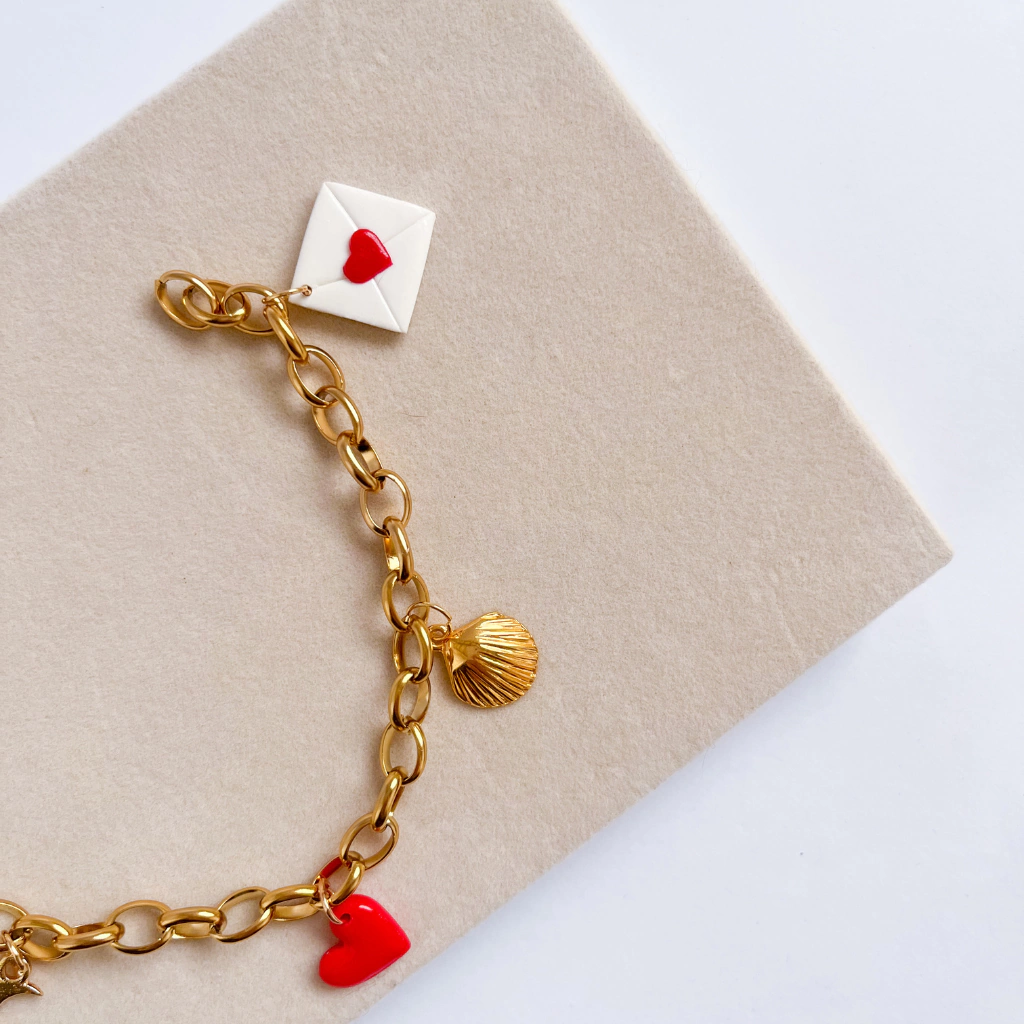 Características do Produto: - Medida: 18 cm - Material: Corrente de aço inoxidável/não enferruja - Pingentes: Coração vermelho, carta e flor feitos à mão de cerâmica plástica. Lua e concha de metal.